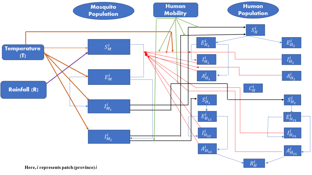 The model considers dengue transmission between provinces (patches), accounting for human mobility between them.