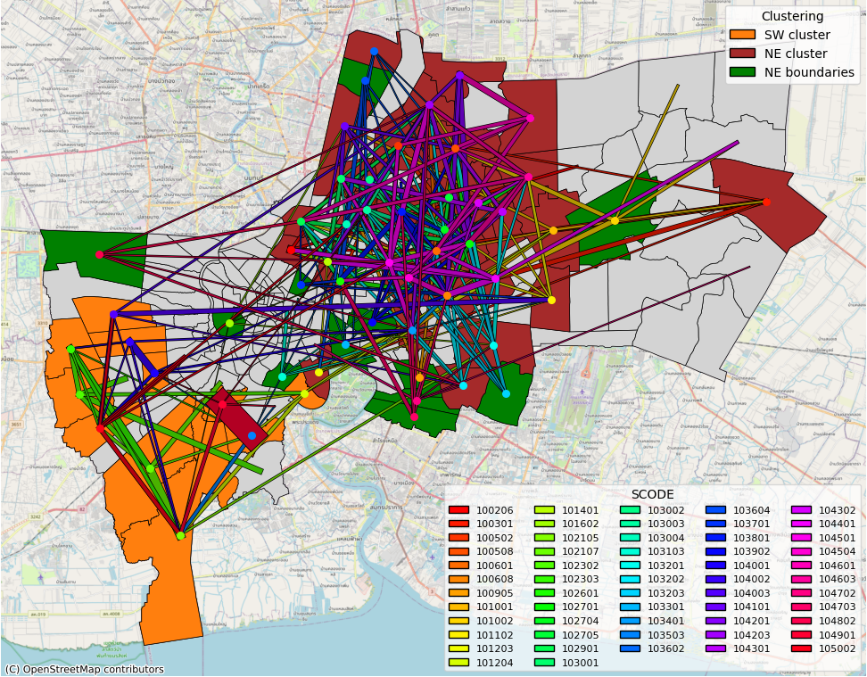 Next, we apply a mixed clustering approach based on inter-khwaeng correlation statistics, assigning these 55 khwaengs to 3 main clusters. By design, khwaengs within the same cluster exhibit higher internal correlation, strong enough to suppose the epidemic patterns are consistent within clusters.