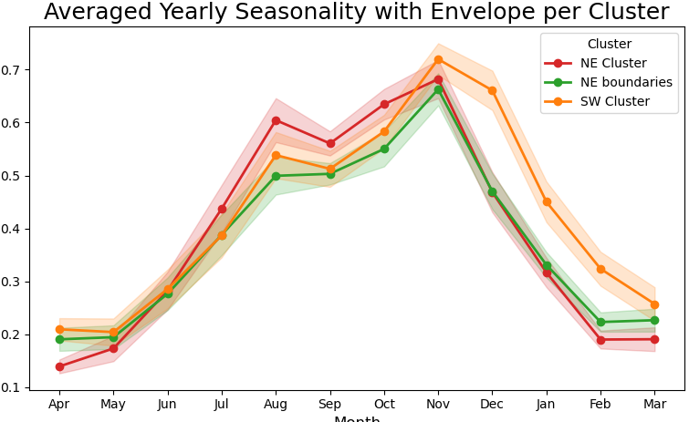Within each cluster, we renormalize the time series to analyze seasonal trends independently of epidemic size. We find distinct seasonal signatures across the clusters.